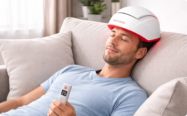 LLLT uses scientifically established wavelengths of red light to increase blood flow around hair follicles and improve cellular energy production (ATP).